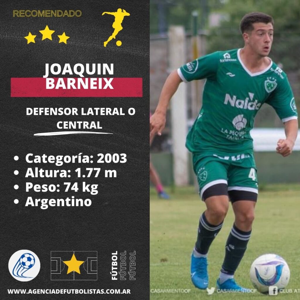Joaquin Barneix Jugador ágil, firme en la marca y con proyección. Con buena visión de juego y presencia a la hora de hablar y ordenar. Edad: 20 años – fecha de nacimiento 27/03/03Estatura: 1.77Peso: 74 KGPierna hábil: Derecho POSICIÓN COMO JUGADOR •Defensor lateral o central ULTIMA EXPERIENCIA DEPORTIVA •2022 Club Atlético Sarmiento de junin (juveniles) •2021 Club Atlético Sarmiento de junin (juveniles) •2020 Club Atlético Sarmiento de junin (juveniles) •2019 Club Atlético Sarmiento de junin (juveniles) •2018 Club Agropecuario Argentino (juveniles) •2017 Club Agropecuario Argentino (juveniles) PERFIL COMO JUGADOR Jugador ágil, firme en la marca y con proyección. Con buena visión de juego y presencia a la hora de hablar y ordenar.
